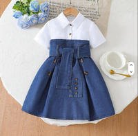 ชุดเดรสเด็กผู้หญิงยาวถึงเข่าแบบมีสไตล์เสื้อผ้าลำลองดีไซน์ใหม่สำหรับฤดูร้อน2025ผ้าเดนิมเย็บปะต่อสีพื้น